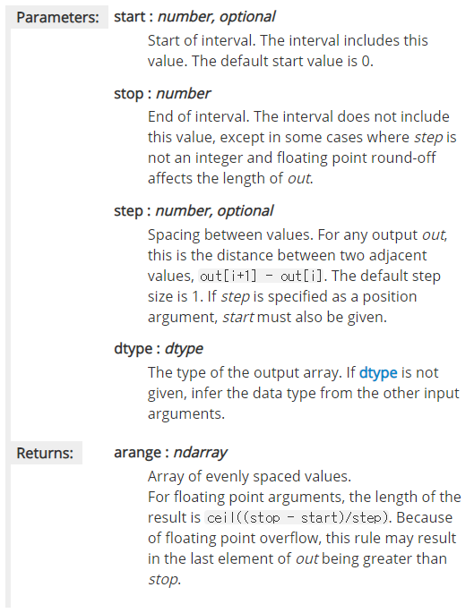 numpy.arange ([start, ]stop, [step, ]dtype=None)